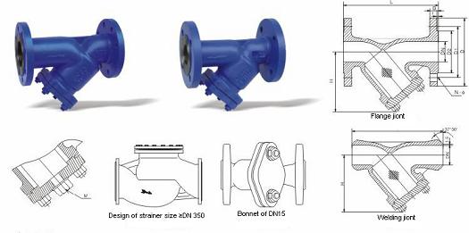 The DIN Y type strainer, material in GS-C25, 1.0402, 1.0460, 1.4301, 1.4401, 1.4406, 1.4539, 2.4856, X5CrNi1810/X5CrNi189, X5CrNiMo17122, X2CrNiMo17132 etc. Pressure in PN10-PN40