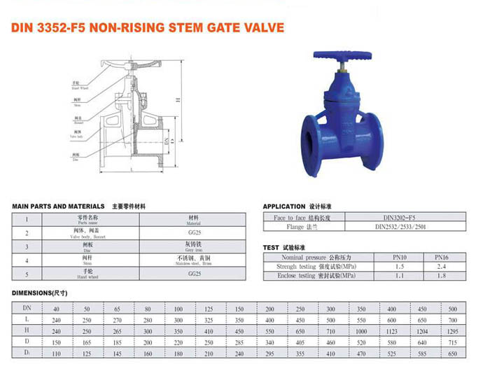 DIN 3352-F5 NON-RISING STEM GATE VALVE material in GG25, wedge in gray iron