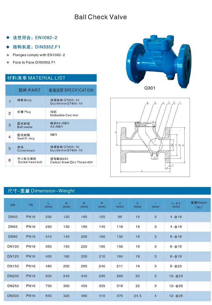 The ball check valve, Flange to EN1092-2, face to face by DIN3352-F1, material in QT450 or GGG40 ductile cast iron, the ball check valve is widely used in water treatment, petro-chemical and fire protection.