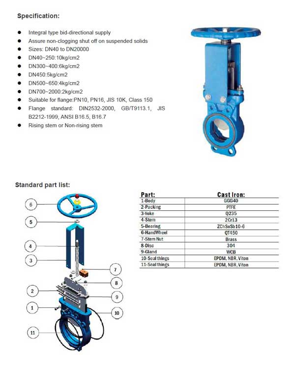 The double seal type knife gate valve, also called double seal sluice valve, is in bid-directional use, size DN40 to DN2000, pressure from PN2 to PN10. The double seal gate valve is widely used in Widely used in paper pulp, mud, power station, chemical industry and other industries.
