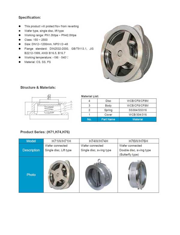 Wafer Dual plate check valve(DPCV) is used for pure pipelines and industrial, environmental protection, water treatment, high-rise building water supply and drainage pipelines, to prevent the reverse flow of the medium. The check valve adopts a clamp type, the butterfly plate is two semicircles, and it adopts a spring for forced reset. The sealing surface can be built-up welding wear-resistant material or rubber lining, with a wide range of use and reliable sealing.